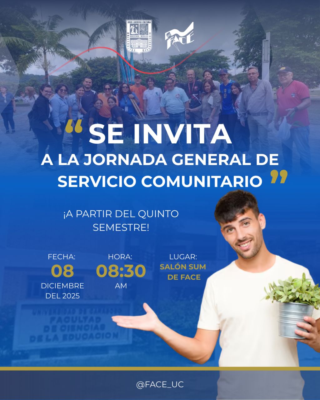 La Facultad de Ciencias de la Educación de la Universidad de Carabobo, invita a los estudiantes regulares a revisar la oferta de las diferentes unidades curriculares para el Periodo Académico de Prosecución (PAP) 2025, dentro de la página de nuestra facultad: https://face.uc.edu.ve/